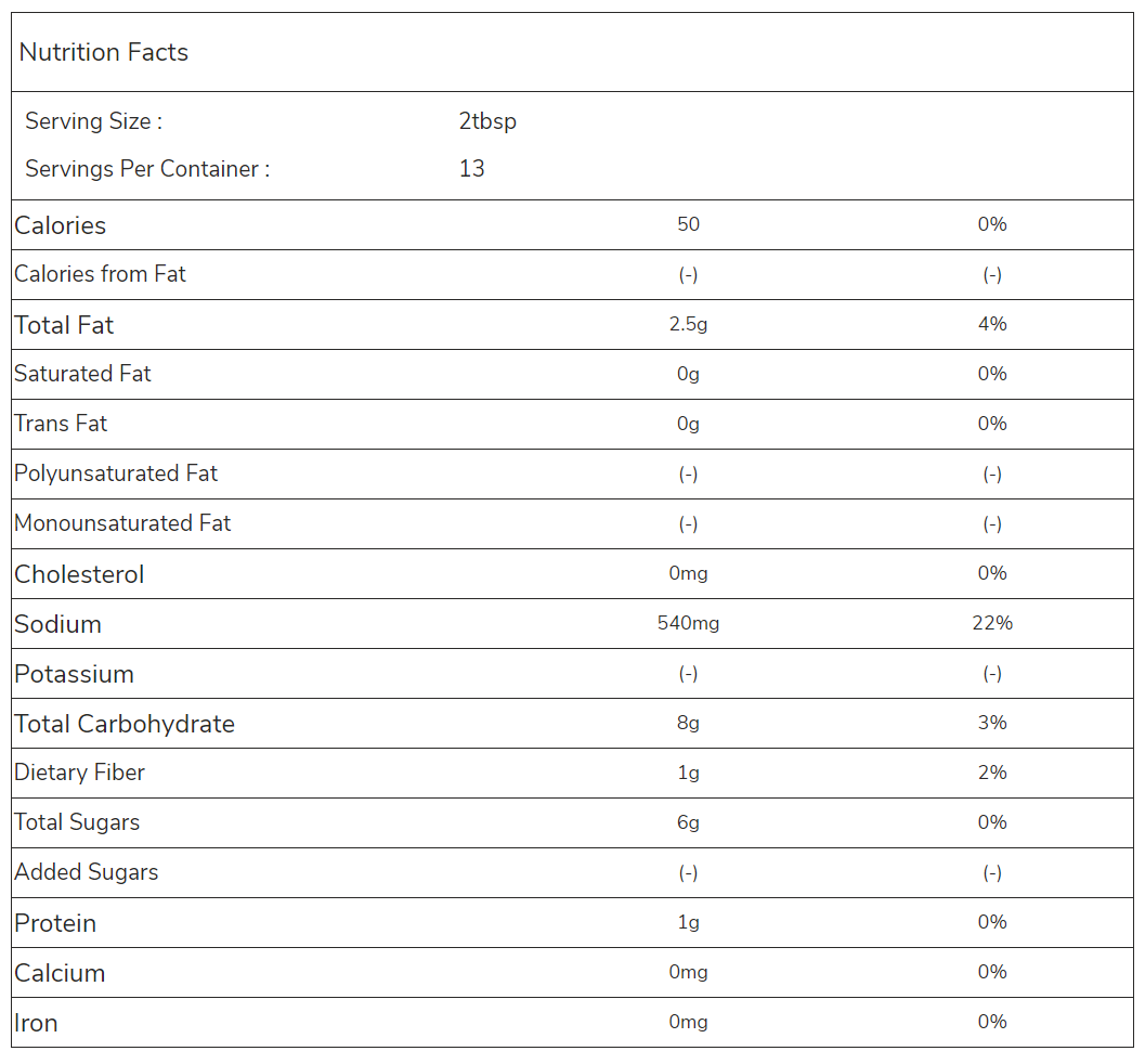 Water, Unsalted Tomato Paste, Brown Sugar, Soy Oil, Sugar, Spice (Garlic Powder, Mustard Flour, Black Pepper), Vinegar, Salt, Smoke Flavor (Aqueous Solution of Natural Hickory Wood Smoke Flavors), Worcestershire Flavor (Salt, Spices, Garlic Powder, Onion Powder, Flavors), Hot Pepper Sauce (Distilled Vinegar, Red Pepper, Salt), Hot Sauce (Louisiana Hot Peppers, Distilled Vinegar, Salt, Xanthan Gum), Molasses, Habanero Powder, Cayenne, Chili Powder (Chili Pepper, Cumin, Oregano, Salt, Garlic, Ethoxyquin (Not More than 100 ppm Added as an Anti-Oxidant]), Crushed Red Chilies, Xanthan Gum.